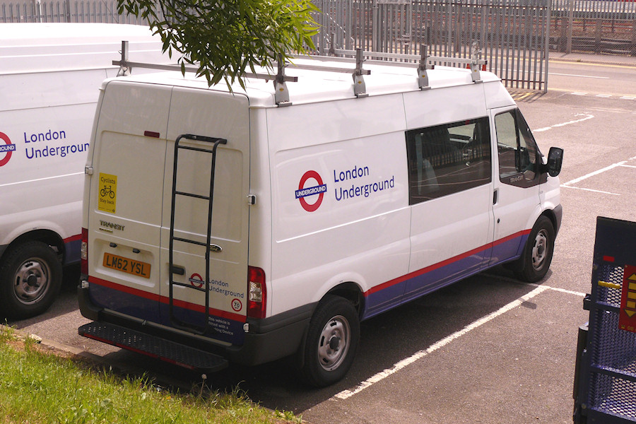 Details: Ford Transit crew van 7513F was first licensed in November 2012 but appears not to have entered service until a few months later. It was first seen at Neasden Station yard on 25th May 2013 (as shown here) and is believed to have replaced very similar 6582F, which went off-lease in April. Note the growing number of notices applied to the rear of such vehicles, this one also having a speed limited sign. |