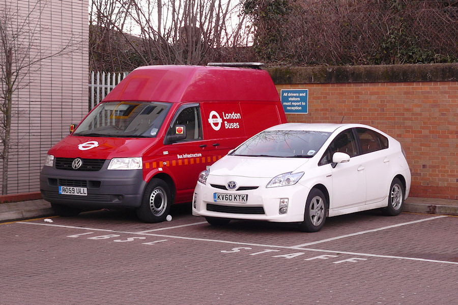 Details: LBSL Infrastructure Volkswagen Transporter van 6823VW is perennially parked in the corner of Cromwell Road Bus Station in Kingston, as here on 11th April 2013. However, the topicality is provided by the plain white Toyota Prius alongside. Early 2013 saw the five Toyota Priuses allocated to TfL Private Hire lose their roundels. The Kingston and Eltham examples also swapped allocations. |