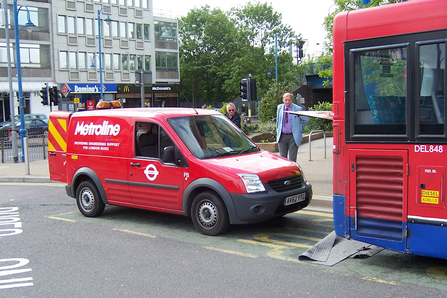 Details: Taken on the day of the open day at the nearby garage (8th June 2013), this photograph shows Metroline Ford Transit Connect van AV62YTG attending to a failed Enviro 200 bus at Potters Bar Station. |