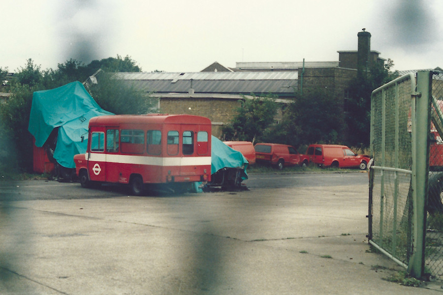 Details: Peering through the fence at the old AEC works in Southall on 28th August 1986, Derek found a few vehicles of interest. Nearest the camera is Ford Transit minibus FS19 (MLK719L). New in 1973 this could be classed as a service vehicle since it was modified as a radio trainer in 1983. Sent to Southall for storage in July 1986, it was sold for preservation in September. Behind this are the sheeted remains of a bus, most likely one of the MCW Metrobuses destroyed by the fire at nearby Southall Garage on Christmas day 1985. Beyond that are three service vehicles, two unidentified Ford Escort vans flanking Bedford Astra van 3275B. All are showing signs of accident damage. |