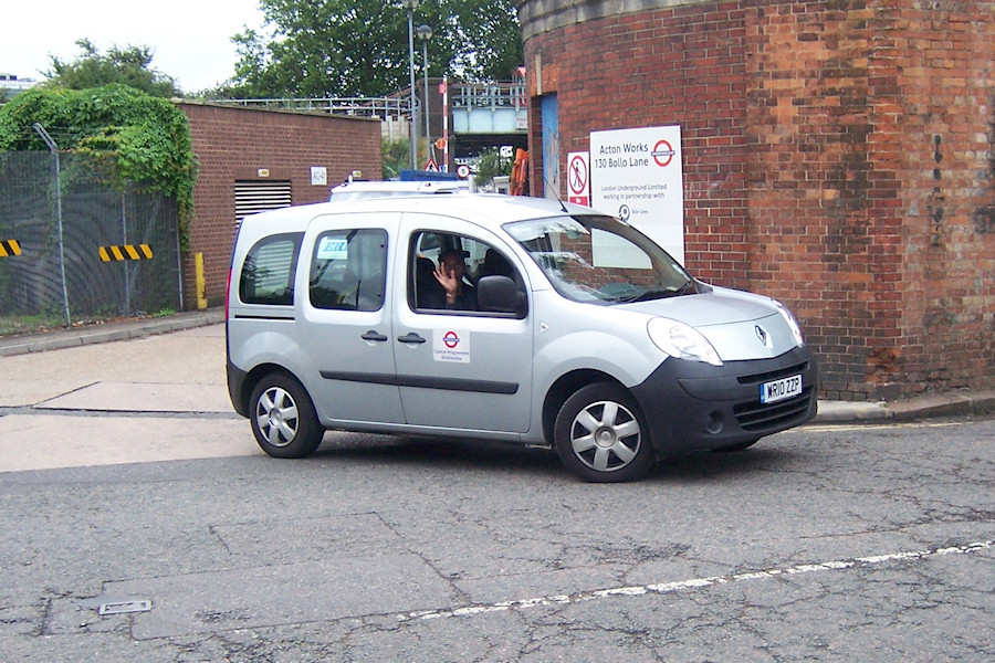 Details: I was slightly annoyed when I saw this photograph. WR10ZZP was one of two Renault Kangoo estate cars delivered in unmarked silver in June 2010. They were a very regular sight in the car park at Acton Works and I surmised that they might actually be allocated fleetnumbers. Therefore I added them to the database here (unmarked cars are not normally covered). However, an official list obtained in October 2012 showed that they were indeed un-numbered and for this reason I left them out of the recently published SUP24F booklet. But then Ray photographed WR10ZZP leaving Acton Works (with a friendly driver) on 2nd August 2013, and it has gained labels with an LUL roundel and 'Capital Programmes Directorate' lettering. I await reports as to whether sister car WR10ZZT also has these. By the way, another slight annoyance is that the DVLA shows the colour of many silver vehicles as being grey. In this case the official colour is 'Cosmic Grey', but I think silver is probably simpler! |