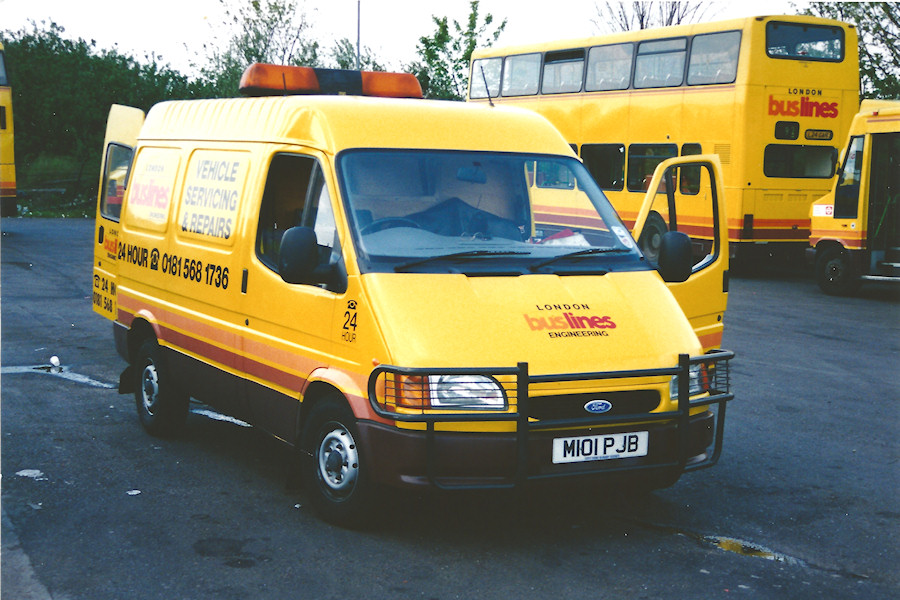 Details: For the first dozen years of bus tendering in London, companies could paint their buses any colour they liked. London Buslines chose a bright livery of yellow with brown relief, later enhanced with orange bands. Photographed at their Southall yard on 6th May 1996 were Ford Transit Mk5 van M101PJB and several buses. Note the mid-mounted light-bar and front bull-bars. London Buslines had been bought by Centrewest earlier in 1996 and was eventually absorbed into the First London operation. |