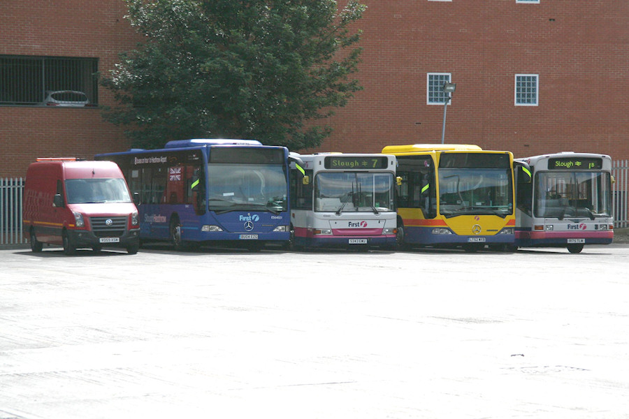 Details: Although it is in the process of removing itself from London bus operation, First retains several subsidiaries to the east and west of the capital. This colourful line-up was photographed at Slough garage on 24th July 2013 and features VW Crafter van VO59XSM. Five very similar vans were used by First London. The buses comprise Mercedes-Benz Citaros ES64021 (in Heathrow blue livery) and ES64013 (in the new but old yellow Beeline livery), and Dennis Darts 42643 (Plaxton-bodied and new to Yorkshire Rider) and 41175 (Marshall-bodied and new to Centrewest). |