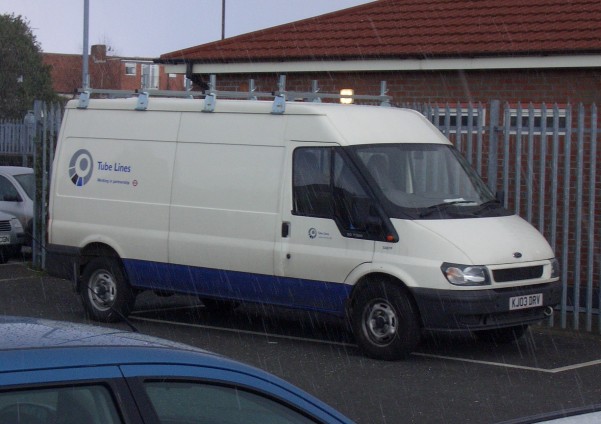 Details: Leap Year's day 2004 was a bright sunny day, apart from a brief but heavy snowstorm which coincided with my visiting Morden station. Parked behind the station was this Ford Transit 90 T350 semi-high-roof van number 5487F (KJ03DRV). The fitting of roof bars appears to have become standard on vans of this type from about 2002. |