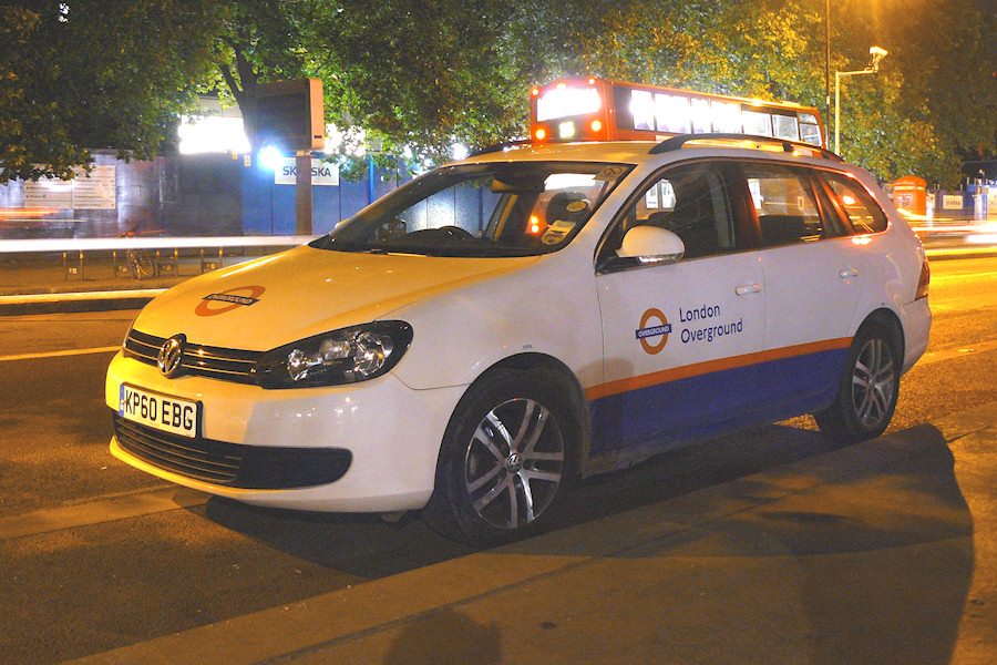 Details: Probably the most interesting vehicle seen on the night of 13th/14th August 2013 was this Volkswagen Golf estate car parked outside Whitechapel Station. One of two operated by London Overground since late 2010, they can often be seen from trains passing the depot at New Cross, but this was the first time one could be photographed. Although not particularly apparent in this photograph, the cars carry a variant of LUL livery with the red of the stripe (and roundel circle) replaced by orange. LUL also operates three VW Golf estates and by coincidence the last vehicle we saw before this one was 7044VW parked near Bethnal Green. |