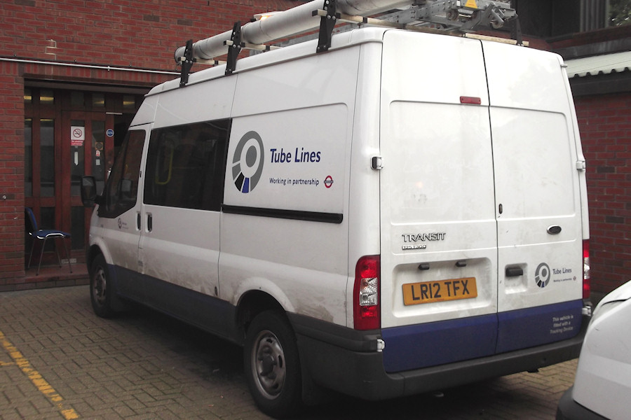 Details: Fleetnumbers 7409 to 7418 are on a batch of 10 Ford Transit crew vans with the rarer medium wheelbase option. Divided between Finchley Central and Stratford Market, several of the vans have non-standard roof racks with a tube and ladder on, suggesting that they are replacements for the similarly equipped all-white vans such as 6260F and 6436F. 7418F was photographed (with permission) parked outside the offices at Finchley Central on 23rd August 2013. Similar 7416F is just nudging in on the right. |