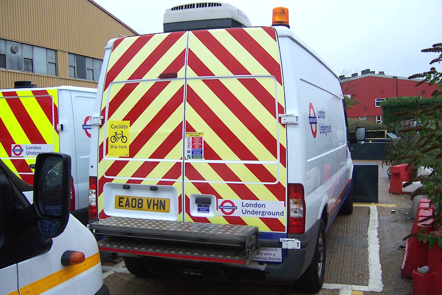 Details: Apart from during the last war, second-hand vehicles have very rarely featured in the central fleet. When LUL took over the former Powerlink contract in August 2013, most of the vehicles used were replaced by new leased stock. An exception was 5-year old Ford Transit van EA08VHN, which was repainted into LUL livery and given fleetnumber 7755F, the highest reported to date. This was probably due to the van having some specialised equipment, and this photograph taken at Tuffnell Park on 14th September 2013 shows that it does have an air-conditioning pod on the roof and a curious folding platform at the rear. |