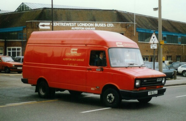 Details: Centrewest bought 3 long-wheelbase Leyland DAF 400 vans in 1989 for use as engineering run-abouts. F811SLU was seen outside its home garage of Alperton on 1st December 1990, but was destined to be withdrawn the following year. This design of van evolved from the Leyland (later Freight Rover) Sherpa. |