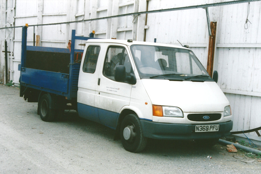 Details: Photographed in the yard alongside Griffith House on 14th May 1998, Ford Transit Mk.5 dropside truck 4566F carries side lettering for LUL Lifts, escalators and pumps. Note the tail-lift which appears to have somewhat extended runners. This location has now disappeared under a new power distribution building. |