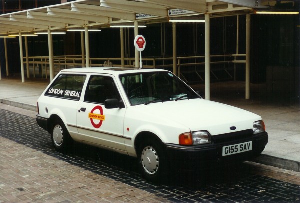 Details: Photographed at Liverpool Street bus station on 18th July 1992, G155SAV was a Ford Escort 3-door estate car operated by London General. |
