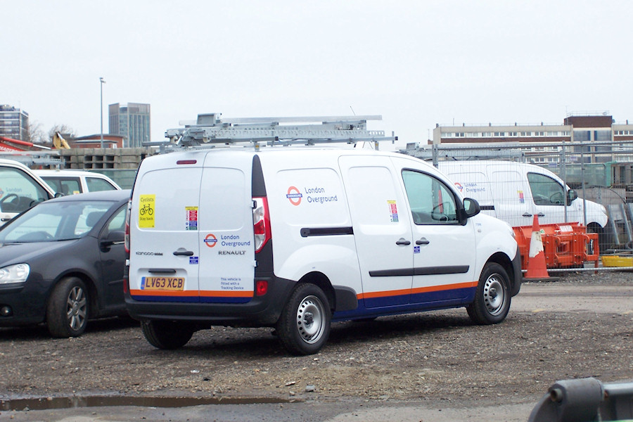 Details: Ray chalks up yet another scoop! The number of vehicles carrying London Overground livery was trebled recently with the delivery of at least four new vans. The reasons for the additions are not clear, since maintenance of the route infrastructure is normally undertaken by contractors. This photograph was taken at Silwood Triangle, a patch of open ground south of Surrey Quays station and bounded by two branches of the East London Line and the Southeastern tracks from London Bridge. A set of sidings is being built here to enable the use of 5-car trains and a vehicle yard has also been created, which will most likely become a permanent LTSV location in due course. Present on 24th January 2014 were a pair of 2-day old Renault Kangoo Maxi vans, with 7789R nearest and 7788R beyond. Note that both have roof racks with 'something' on them. Two VW Transporter crew vans were also on site, but could not be photographed due to the presence of several contractor's vehicles. One of the VWs can just be seen in the left background. |