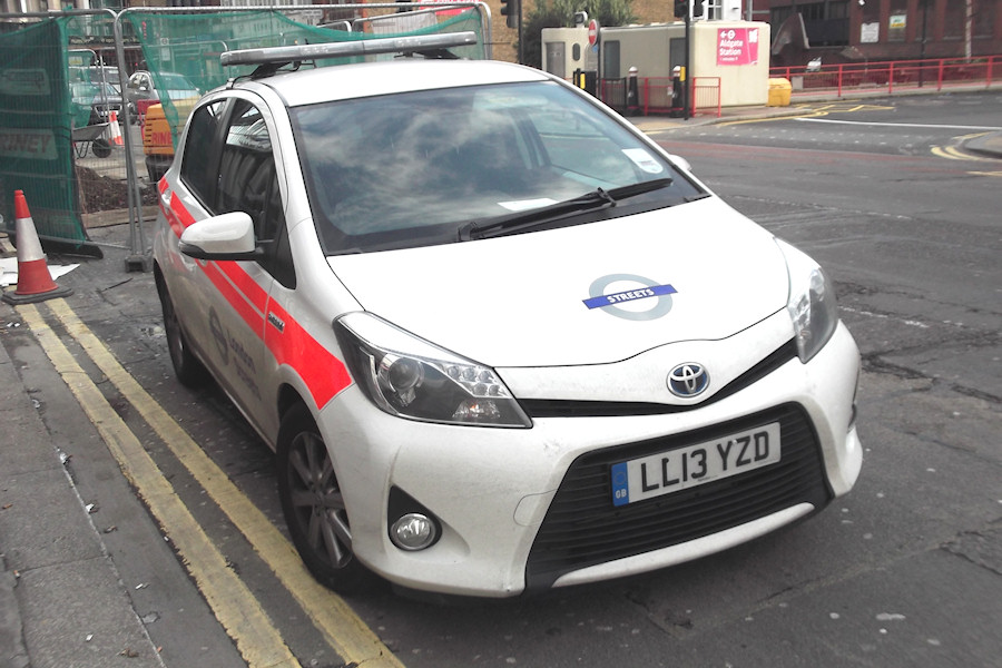 Details: TfL Streets took delivery of a pair of Toyota Yaris hybrid cars in June 2013, seemingly to replace two of the larger Prius cars. LL13YZD was found parked outside Aldgate Station on 12th January 2014. A similar car is operated by LUL (7667T) but has yet to be photographed. |