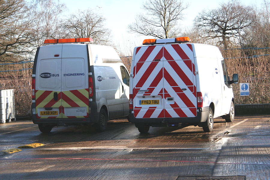 Details: Metrobus has recently taken delivery of three new Ford Transit vans, for engineering support duties from their three main garages. Although licensed in September 2013, the new vans were first reported in early January 2014. Derek photographed 9105 (FY63TBU) at Crawley Garage on the 14th, parked alongside the Renault Trafic van that it replaced (9101 LX58XCP). The new vans are short-wheelbase, mid-height Transits, the same as ones delivered to several London Central and London General garages. |