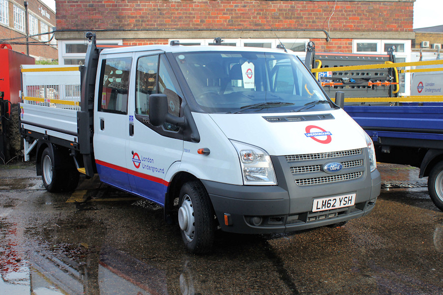 Details: Looking like a brand-new vehicle, complete with 'Ready to go' tag in the windscreen, Ford Transit dropside truck 7591F was photographed at Acton Works on 18th February 2014. However, 7591F had been delivered over a year earlier, and was initially operated in unmarked white livery. As well as being given LUL livery (but with the bodywork still in white), it has also been modified with side safety bars and spotlights on the headboard. |