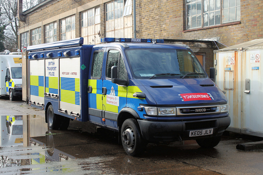 Details: Photographed at Acton Works on 18th February 2014 was KE05JLV, one of a pair of Iveco Daily trucks new to British Transport Police but operated by the Emergency Response Unit since 2012. It was still carrying its original callsign of L91 (it was officially changed to L93 some time ago), while it also has labels and signs over some of the police markings and a 'This vehicle is not in service' notice in the windscreen. Such measures are required when vehicles in police livery are driven by non-police personnel. Similarly, cars used in filming the TV series 'The Bill' had their markings taped over when being driven to filming locations. |