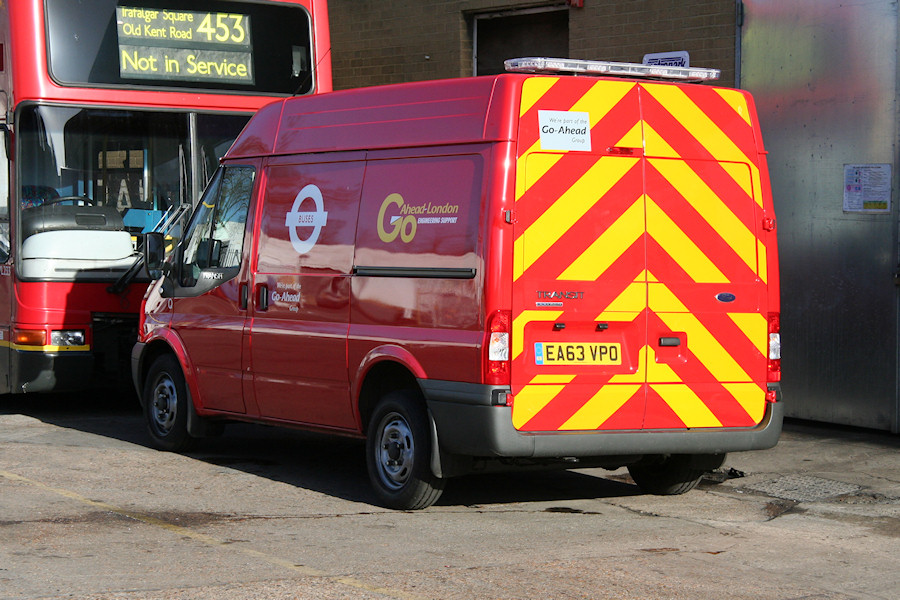 Details: Go-Ahead London has been updating its engineering support fleet in recent months, new Ford Transit vans going to several London General, London Central and Metrobus garages. Camberwell received EA63VPO towards the end of 2013, and it was photographed at home on 26th February 2014. Note the allocation code carried below the mirrors. |