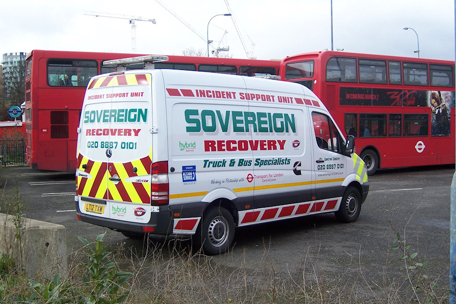 Details: With the usual copious lettering, LT12TXW is a Mercedes-Benz Sprinter van belonging to Sovereign Recovery. It was photographed at the soon-to-be-closed bus stand at Lewisham on 28th February 2014. The oft-delayed plan to move the bus stands to a new location on the other side of the railway station finally took place the following day. Note the risers fitted to the rear light-bar. |