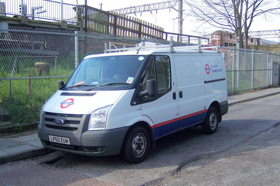 Details: Ford Transit van 7019F is rather elusive. It was originally officially allocated to Hearne House in Acton, but it has not been seen there during recent visits. In fact probably fewer than half of the 21 vehicles we currently have listed as being allocated to Hearne House are actually there. So where is it now? Perhaps it is assigned to the Depot Engineering Support unit, which would account for reports of it at a variety of railway depots over the past few years. On 18th March 2014 Ray found 7019F parked outside Stonebridge Park Station. To the right is the roadway that leads to the LUL depot, while in the background can be seen a class 90 locomotive on Caledonian Sleeper carriages. |