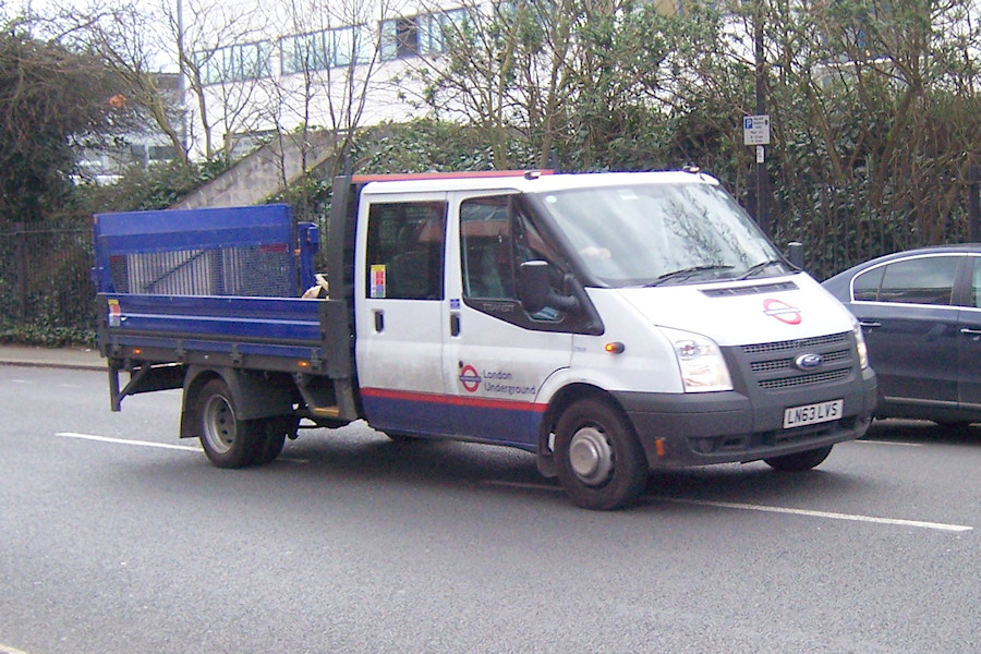 Details: One of the most remote LUL locations is that at Rickmansworth Station, with about a dozen vehicles allocated. Fortunately, these can sometimes be seen visiting Acton Works. Ray caught Ford Transit dropside truck 7701F heading up Bollo Lane on 17th March 2014. |