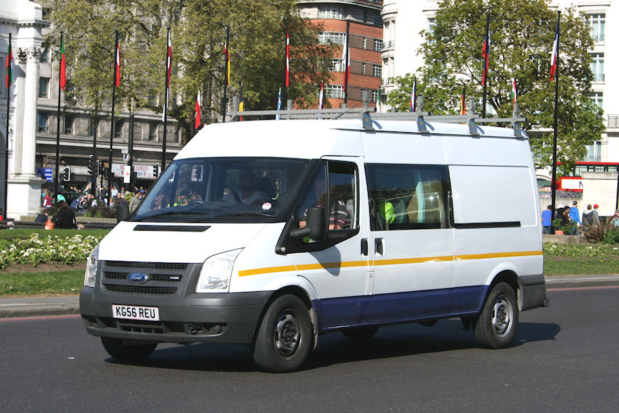 Details: Four years after leaving the fleet, Ford Transit crew van KG56REU is still instantly recognisable as a service vehicle. It retains the blue skirt, though has had a (reflective?) yellow stripe added. As such, the livery looks even more like the current Balfour Beatty scheme. New in January 2007, this van carried Metronet markings and fleetnumber 6019F. It was photographed passing Marble Arch on 15th April 2014. |