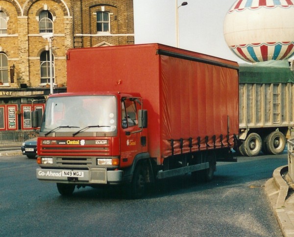 Details: Passing through Vauxhall on 22nd March 2000, this Leyland DAF 45 curtain-sided lorry was operated by London Central. The 45 model was based on the earlier Leyland Roadrunner, and this is the only example of the type known to have operated as a service vehicle. |