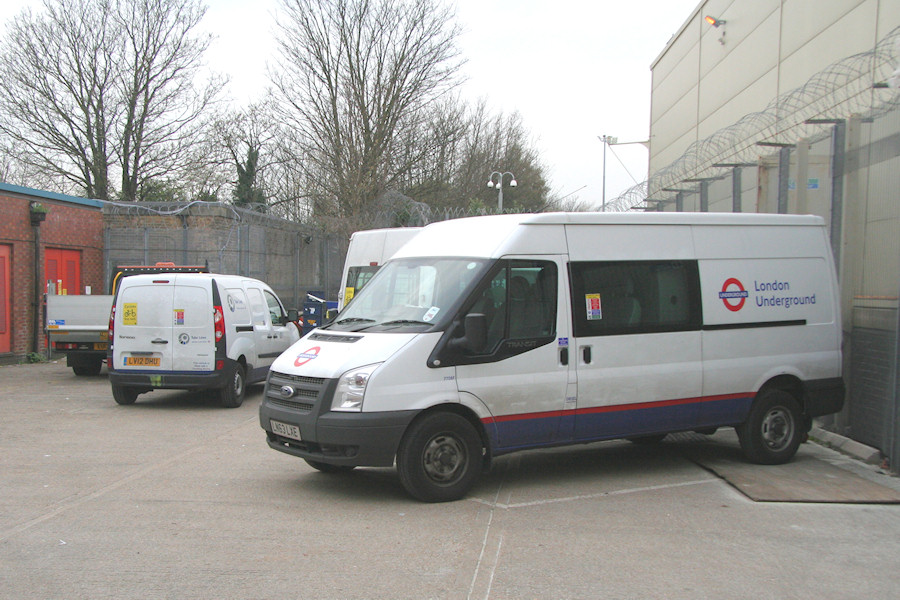 Details: At least 5 service vehicles were parked in the back yard of the Track and Signals Operations Centre at Acton Town on 2nd April 2014. Nearest the camera is Ford Transit crew van 7708F (similar 7709F is out-of shot on the left), whilst behind is a Transit minibus believed to be 7706F. 7351R is the Renault Kangoo Maxi van towards the left, with un-numbered Transit dropside EU13XES beyond. The last-mentioned vehicle now has LUL labels on its all white livery. The large building to the right is the Museum Depot. |