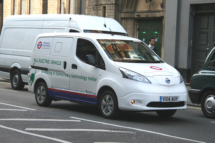 Details: Derek was in central London on 30th April 2014 to photograph some of the many extra buses laid on due to a tube strike. A lucky catch was this view taken at Cambridge Circus of a Nissan e-NV200 electric van. It carried full LUL livery, with the latest 'TfL, Every Journey Matters' logo and extensive 'green' lettering. No fleetnumber was evident, on the offside at least. The e-NV200 is (perhaps unsurprisingly) an electric-powered version of the NV200 van. Several examples of the latter were used by the Cycle Hire operation but all seem to have been withdrawn since. One curious aspect of this new vehicle is that it looks like it has side windows that have been covered over, rather than being a plain panel van. |