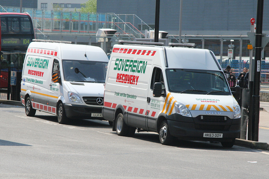 Details: Sovereign Recovery has been adding several vans to its fleet recently. Having started out with mainly Ford Transits, and later trying Volkswagen Transporters, the latest additions have been mainly Mercedes-Benz. However, a pair of Iveco Daily vans were acquired in spring 2014. One of these (HK63OOY) was photographed at Stratford Bus Station on 30th April 2014, parked in front of earlier Mercedes LL11XLT. The liveries on the two vans are similar but with numerous detail differences. |