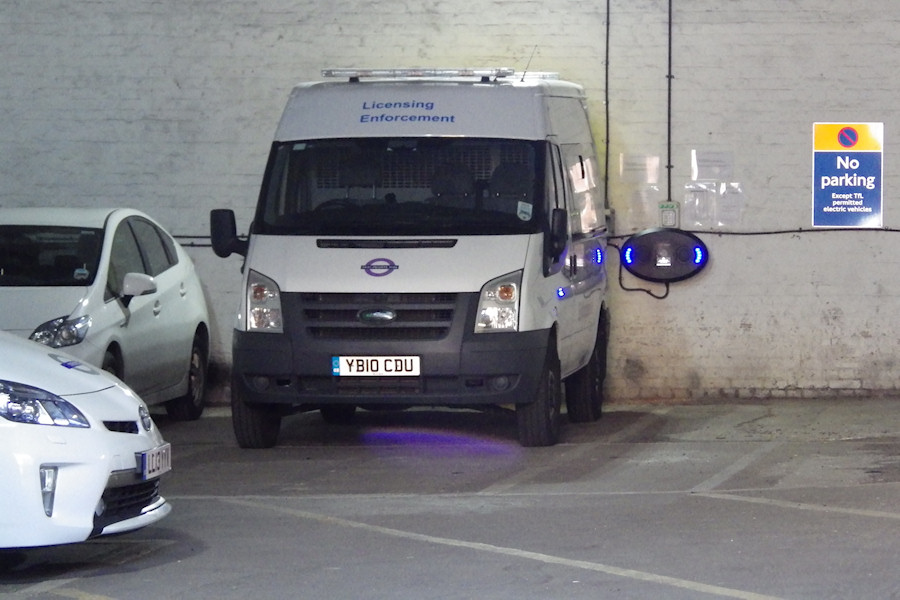 Thomas Young | To clarify, the roundel on the van is purple with 'TAXI - PRIVATE HIRE' lettering, the roundel on the car on the left is grey with 'STREETS' lettering. I saw the car (LL13YYV) during the week and it does carry the normal TfL Streets white/orange livery. The other Toyota Prius visible in this photograph (parked beside the van) appears to be in anonymous white livery. | Sun 29/06/2014, 11:17 |