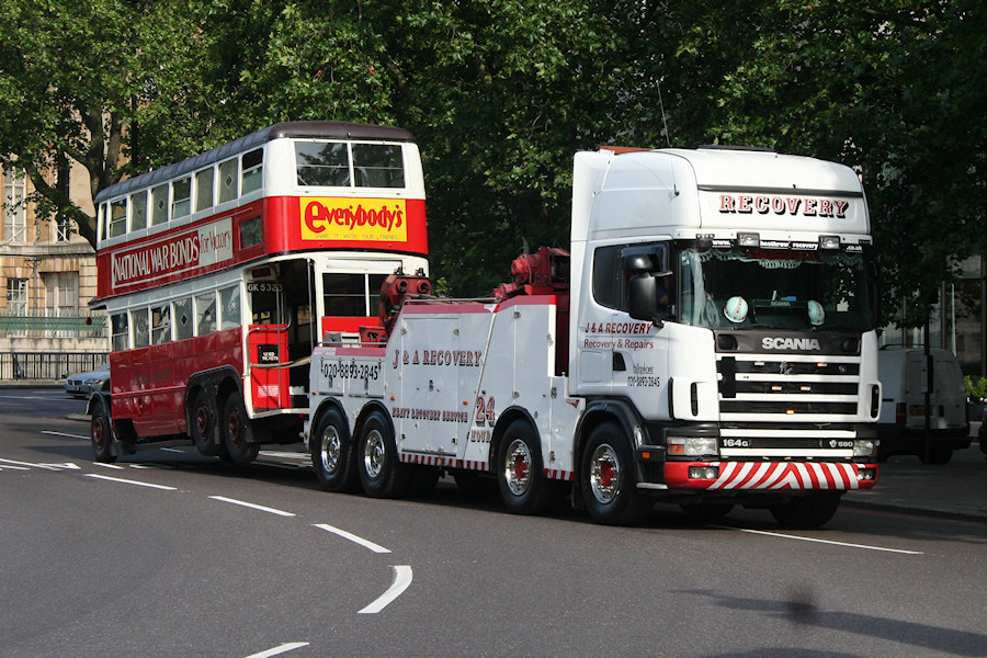 Details: Another Cavalcade participant that required towing was AEC Renown LT165. This was given a suspended rear tow by a Scania recovery vehicle belonging to J&A Recovery. Curiously, there is no registration plate visible on the front of the Scania, although looking at other photographs suggests that this is in fact CS02REC. I also discovered that this vehicle has previously been illustrated working for C Spearing. Note the slightly saggy appearance of the preserved bus, and the way the rear axles seem to rest horizontally. This photograph was taken at Hyde Park Corner in the morning. By coincidence, another bus numbered LT165 probably passed here soon afterwards, this being one of the Wright 'New Bus for London' vehicles allocated to London United's route 10. |