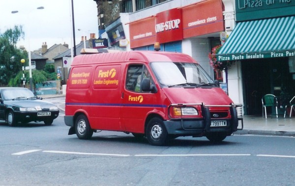 Details: With a non-standard blue-stripe on its red livery, Ford Transit van T799TTW was allocated to the Greenford garage of First Centrewest, and was caught on film at Ealing Broadway on 23rd September 2003. |