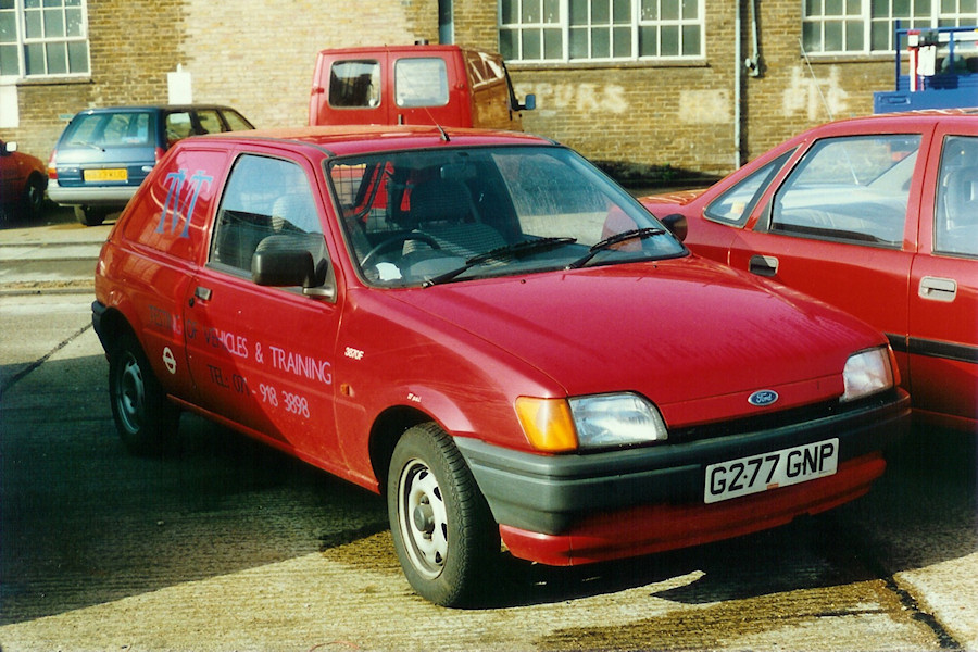 Details: Unusual lettering was carried by at least 2 Ford Fiesta vans in the early 1990s. On a base red colour, these were signed for 'TVT, Testing of Vehicles and Training'. 3870F was photographed at Acton Works on 2nd April 1993, just before it was returned off-lease. The other example, 4190F was also photographed nearby on the same date, and may have been a direct replacement. |