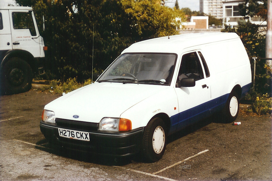 Details: Ford Escort van 3905F was just a couple of weeks old when photographed at Acton Works on 30th September 1990. The white wheeltrims were perhaps not too practical and were later removed, while Distribution Services lettering was added to the doors. Note that the tyre pressures are shown in both BAR and PSI. |