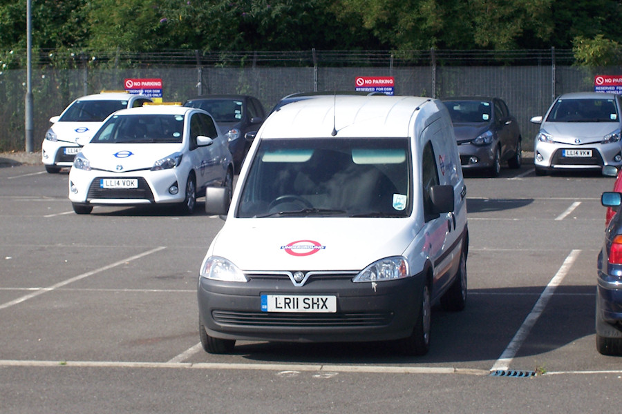 Details: Taking photos through the fences of the front car park at Acton Works is very tricky, and Ray did well to capture this view on 28th June 2014. To the fore is Vauxhall Combo van 7032V, latterly one of the nocturnal Griffith House vehicles but probably now awaiting disposal. Of more interest are the vehicles in the background. On the left are two Toyota Yaris hybrid cars in white/blue livery with TfL lettering and small light-bars. This livery had previously only been seen on uniform issue vans and the role of these new cars was not yet known. Also visible are several unmarked Yaris cars (including silver LL14VKW). The notices attached to the back fence state that those parking spaces are reserved for DSM pool vehicles only. |