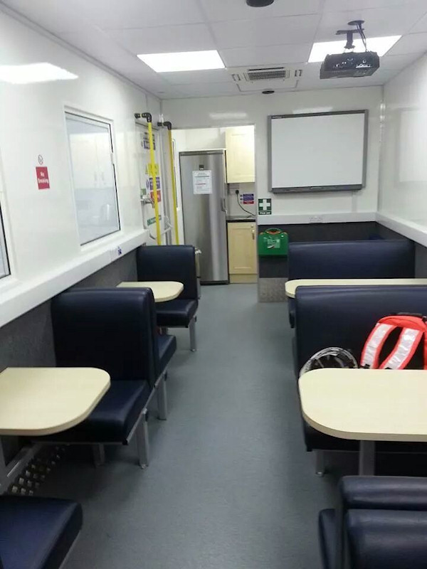 Details: This rare view of the inside of a service vehicle shows recently converted Mercedes-Benz Axor lorry WX08KUY. As can be seen, it is no longer a dropside lorry! Instead it now has a large box body which has been fitted out as a mobile crew facility. This view (looking toward the front) shows the meeting/dining area (with 16 seats) that occupies the middle of the vehicle. A projector and whiteboard also feature. Ahead of the nearside door is a full-width kitchen area. There are five large windows with integral blinds, two on the nearside (seen here) and three on the offside, along with smaller windows in the kitchen. Out of sight towards the rear are the back door (with built-in steps), a small desk, and an enclosed area that may include a toilet. |