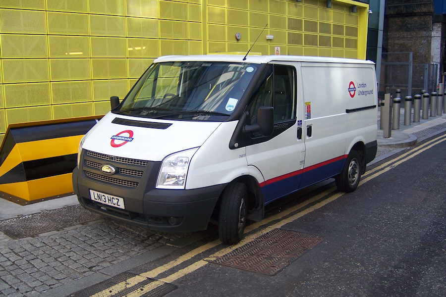 Details: Ford Transit van 7651F was photographed at the back of the Palestra building in Southwark on 13th August 2014. This is an internal mail van outbased at London General's Merton Garage (which accounts for earlier reports such as that of 5849F). The smaller Mk.7 Ford Transit vans (such as this one) are likely to be replaced by Ford Transit Custom vans when their time comes. Note the huge security barriers and mesh doors protecting the covered loading bay. There is also an underground car park accessed by a ramp behind the bollards in the right background. |