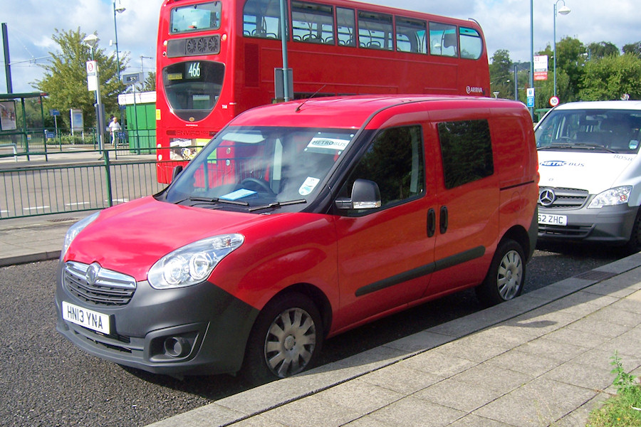 Details: During 2014 the management of the Metrobus operation has been gradually shifted to other Go-Ahead companies. The Crawley base is now overseen by Brighton and Hove, while the 'red' garages of Croydon and Orpington are now part of Go-Ahead London (using the London General operator's licence). There had already been a few transfers of service vehicles between Metrobus and other Go-Ahead companies but a further set of swaps took place in mid-2014. The five newest Mercedes-Benz Vito minibuses at Metrobus's Croydon garage (fleetnumbers 8065 to 8069) were sent to London General's Northumberland Park. Going the other way were five of the six red Vauxhall Combo crew vans, now allocated fleetnumbers 9033 to 9037. The Combos are still in anonymous red livery but at least have company names in the windscreens, as seen on HN13YNA (to be fleetnumber 9036) at Addington Village on 9th August 2014. Parked behind is Mercedes-Benz Vito minibus 8058 from Orpington garage. |
