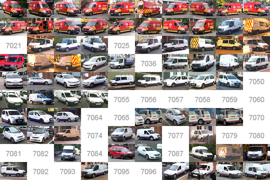 Details: Thanks to the large number of people that contribute photographs of service vehicles, I have built up an extensive library of images over the past few years, and coverage of the recent fleet is running at quite a high percentage. This montage shows vehicles in the number range 7001 to 7100, of which 75 have been captured. Many (but not all) of the photos shown have already appeared on LTSV. Vehicles in this range are now all over 3 years old and disposals have started. As such, it is unlikely that the coverage will increase much more. |