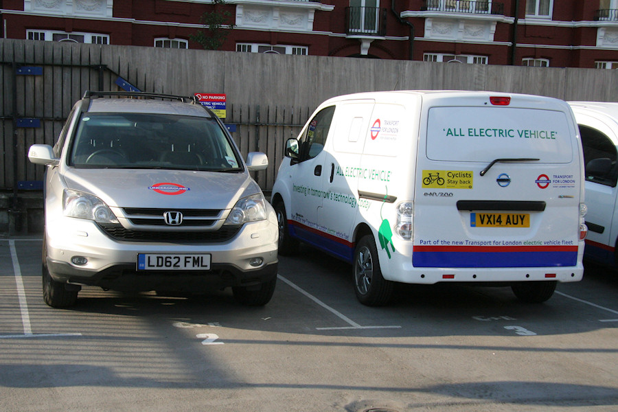 Details: On 5th August 2014 Derek visited Edgware Road Station and found Nissan e-NV200 VX14AUY parked in the charging bay. It is presumed that these electric vehicles are still being operated on a trial basis. Indeed a Renault Zoe electric car appeared here later the same month. Regular resident Honda CR-V 7609H is also on show, while Renault Kangoo Maxi 7758R is just visible on the right. |
