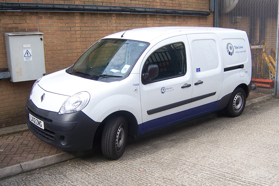 Details: Parked outside the Track and Signals Operations Centre on Museum Way at Acton Town on 13th September 2014 was Renault Kangoo Maxi van 7350R. Tube Lines-liveried 7346R to 7352R are all based either here or at the nearby Bollo House. |