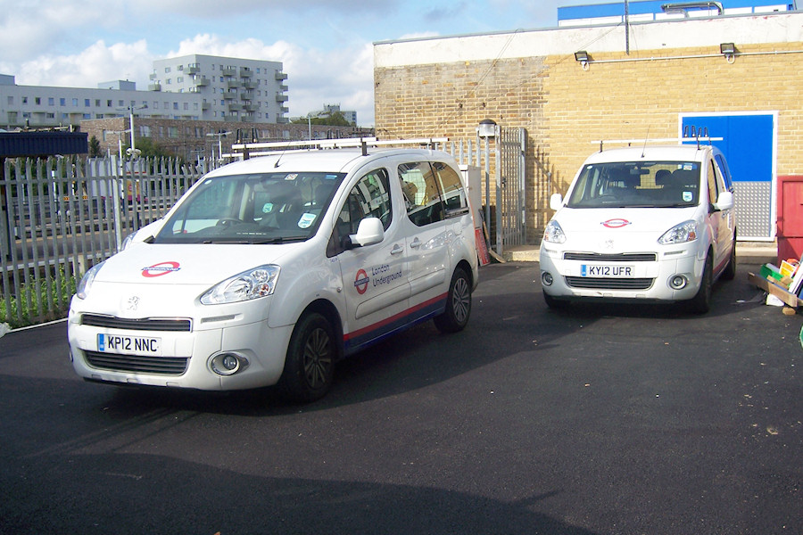 Details: The small base at Barking Station (Wakering Road) was altered during autumn 2014. The stacked portakabins were removed and the space resurfaced as an extended yard. This has had two results. Firstly, the four cars allocated here no longer need to be squeezed in. Secondly, they will be more visible from the station platforms. On 3rd October 2014 three of the four Peugeot Partner Tepee cars were present, with 7451P nearest and 7450P on the right. |