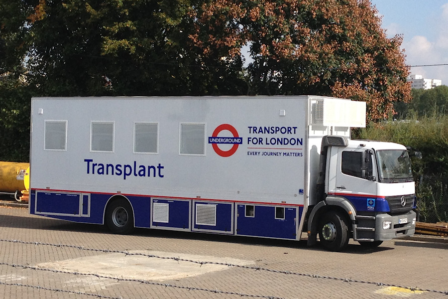 Details: On 8th September 2014, Colin managed to photograph the offside of recently converted mobile office WX08KUY in the lorry yard at Acton Works. The body style on this vehicle reminds me of the mobile blood banks, a connection unwittingly reinforced by the huge 'Transplant' lettering. The label on the cab door is for the TfL Fleet Operator Recognition Scheme (FORS). |