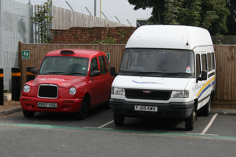 Details: Seen at Watford Junction Station on 17th September 2014, these two vehicles are in different liveries but both seem to be in use as crew ferry vehicles with Arriva the Shires. On the left is CF102 (R957YGC), one of two LTI TX1 taxis given red livery. The LDV Convoy minibus was recently acquired from Tellings Golden Miller, whose livery it still carries. An official fleetlist showed this vehicle as being assigned to TGM Essex at Harlow, with fleetnumber V107. However, reports suggest it is actually working from the Garston garage of associated Arriva the Shires. |