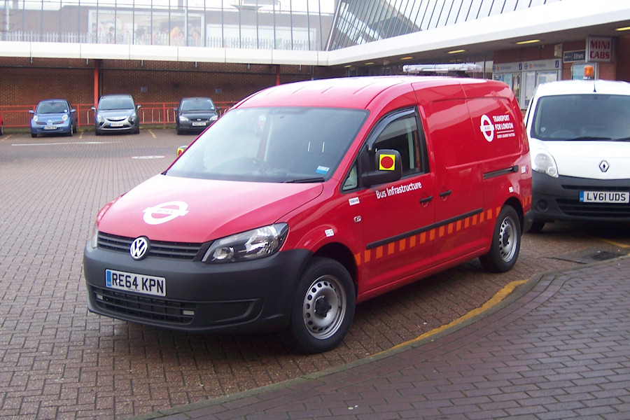 Details: While the London Buses IRU fleet was between 3 and 4 years old at the end of 2014, the Infrastructure section was still using some Volkswagens new in 2009. Replacements finally started arriving in December, comprising a large batch of Volkswagen Caddy Maxi vans. Two similar vans had been delivered in October 2013 (7747VW/7748VW) and they were evidently deemed suitable. The first of the new vans entered service just before Christmas, with further deliveries in January. 7896VW was dispatched to Orpington, but was photographed at Eltham Bus Station on 9th January 2015. Compared to 7747VW/7748VW, the new vans have TfL lettering and lack the roof racks. |