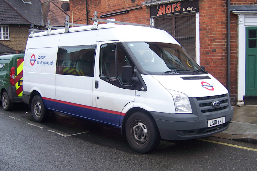 Details: Fleetnumbers 6907F to 6940F appeared in mid-2010 on a large batch of long-wheelbase Ford Transit crew vans allocated mainly to Acton Works. Disposals of the batch started in mid-2013 but around half survived into 2015. The first nine of the batch featured roof-racks, as shown by 6909F at East Acton on 31st January 2015. |