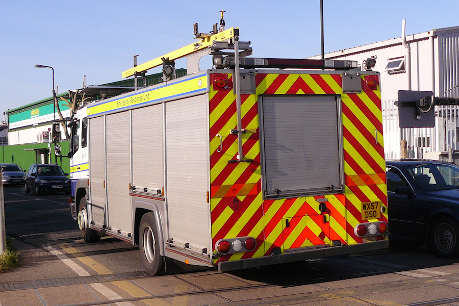 Details: Emergency Response Unit tender 2595 was photographed on the Bollo Lane level crossings on 18th February 2015. Of note is that it now has some sort of fitting on the roof, presumably to carry and off-load ladders. It also now has Transport for London fleetnames in place of the Tube Lines logo. |