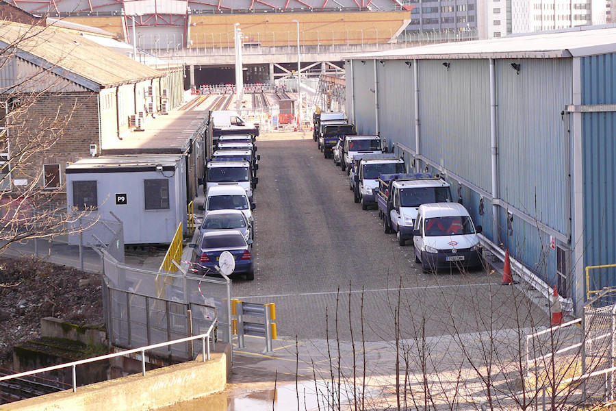 Details: Some changes have been made at Lillie Bridge Depot recently. The entrance by West Kensington Station has a new security point, and now seems to be used a lot more for vehicle movements (despite the narrowness of Beaumont Avenue). At the east end of the depot, the area between two of the buildings has been given over to vehicle parking. Previously there were two tracks here for stabling engineers trains (as seen in 2009). This area can be clearly viewed from the Cromwell Road bridge but only a few of the vehicles will be identifiable. On 18th February 2015 at least 14 service vehicles were visible, most of them Ford Transit dropsides. Leading on the right was Volkswagen Caddy crew van 7118VW, based here since September 2011 but infrequently reported. |