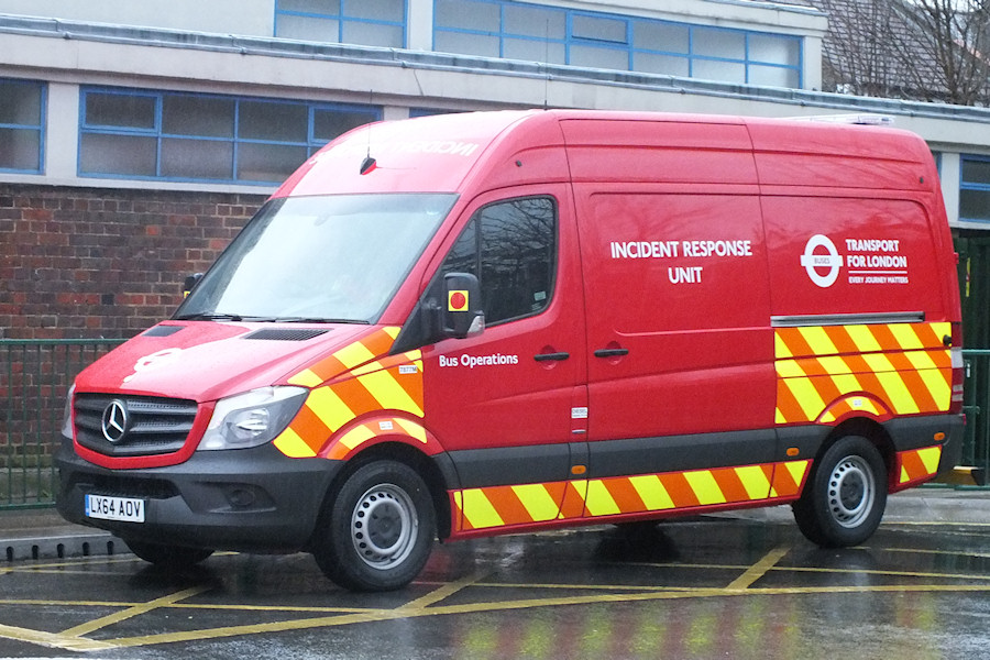 Details: Sitting in a damp Turnpike Lane Bus Station on 19th February 2015 is recently delivered Mercedes-Benz Sprinter van 7877M. Several more new vans are expected here to replace the remaining 2011/2012 IRUs. |