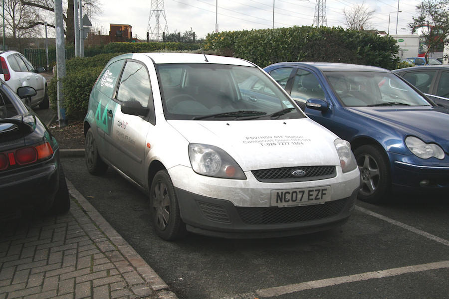 Details: Ford Fiesta van NC07EZF was acquired by Abellio in 2011 and was initially used in plain white livery. Originally at Battersea, it later moved to Beddington Cross and gained fleetnumber 6716. By early 2015 it had been treated to this new livery of white with a green rear half. The lettering is to advertise the VOSA Authorised Testing Facility offered by the company. Photographed on 4th February 2015. |