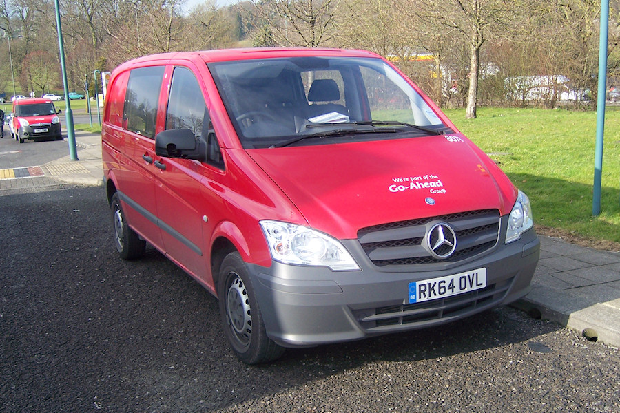 Details: This vehicle is less than 5 months old but is already with its second operator. Mercedes-Benz Vito crew van RK64OVL was one of two seen working from Go-Ahead London's Rainham garage in October 2014. By the following February it had moved to the former Metrobus garage at Croydon. As with Vauxhall Combo van HN13YNB visible in the background, it has now gained Go-Ahead lettering and a Metrobus fleetnumber. Photographed at Addington Village Interchange on 9th February 2015. |
